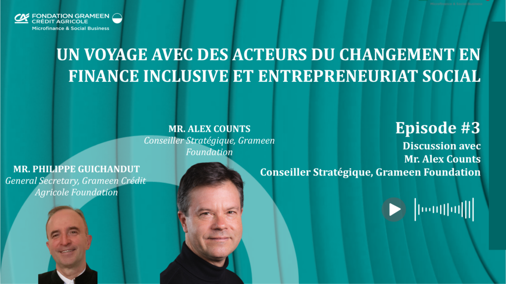 La Fondation Grameen Crédit Agricole poursuit sa série de podcasts qui vous présente des histoires transformatrices de leaders de la famille Grameen qui redessinent le paysage de la finance inclusive et du social business à travers le monde. Dans ce troisième épisode, nous rencontrons Alex Counts, fondateur de la Fondation Grameen et architecte pionnier de la microfinance depuis plus de 30 ans, pour explorer sa vision d’un mouvement Grameen unifié et coordonné.